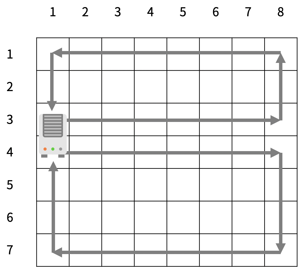 윗부분을 예시로 들자면 3번째 줄에서 왼 -> 오 방향으로 먼저 밀고 그 끝부분까지 밀고 나면 밑에서 위로 또 밀고....