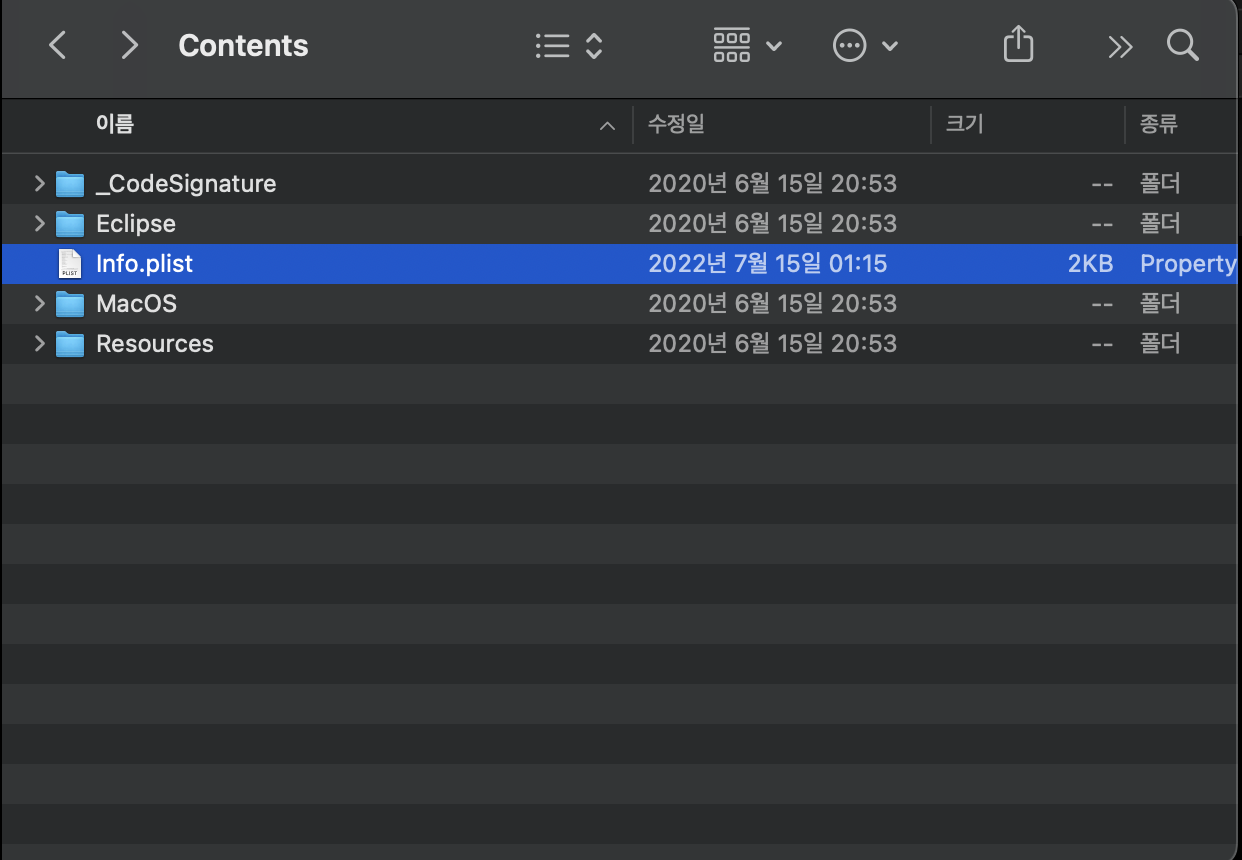 응용 프로그램 폴더로 이동해 이클립스를 찾아 패키지 내용 보기를 누른다. 그럼 그 안에 Contents라는 폴더가 있다.
