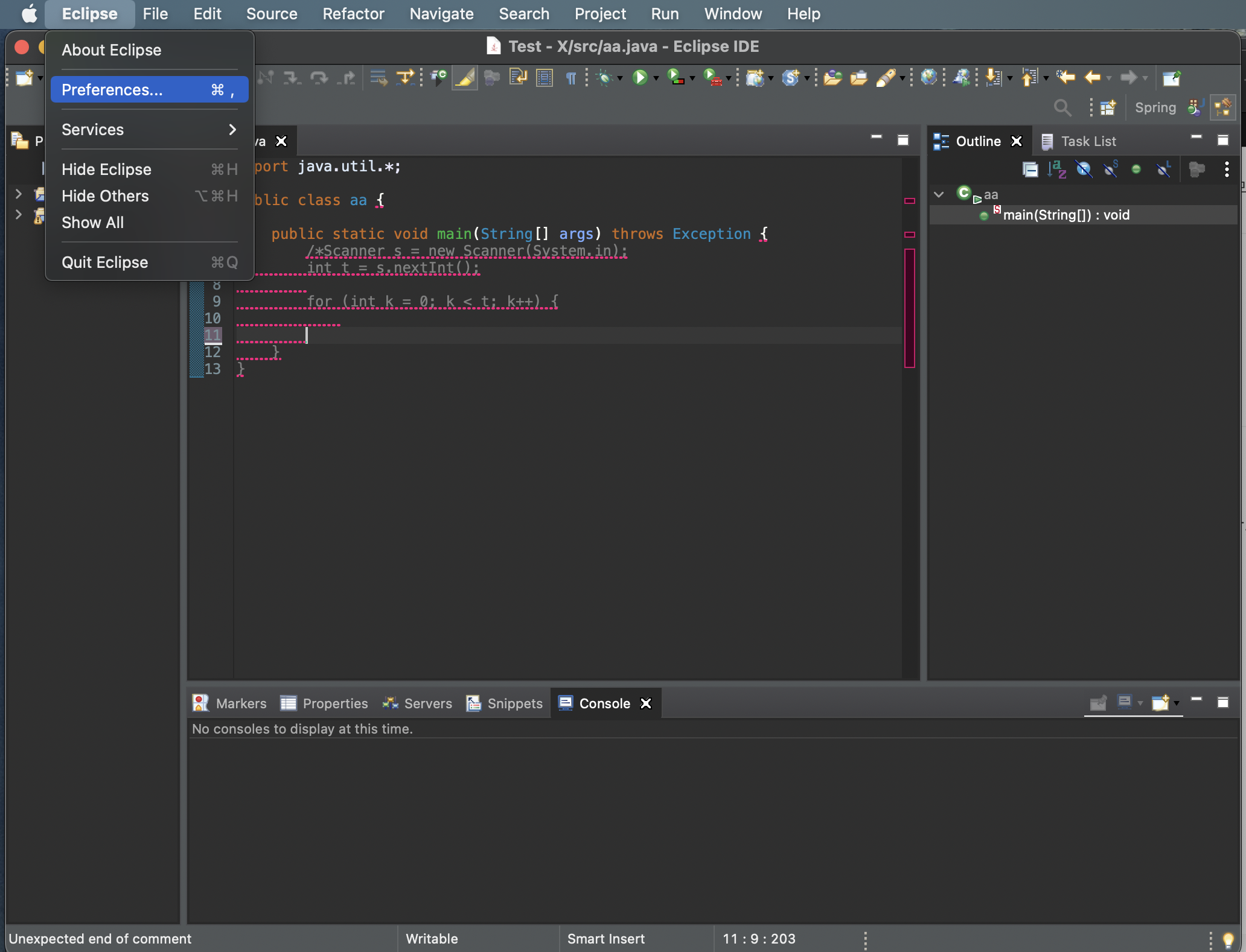 Eclipse를 실행한 상태에서 Preferences로 이동. (윈도우에서는 Window탭에 있다)