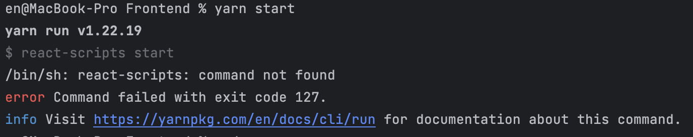 React를 시작하려면 보통 npm start로 하는데 프론트에서 yarn으로 만들었다고 해서 readme에 적혀있는 대로 yarn start라고 했는데 에러가 발생했다.