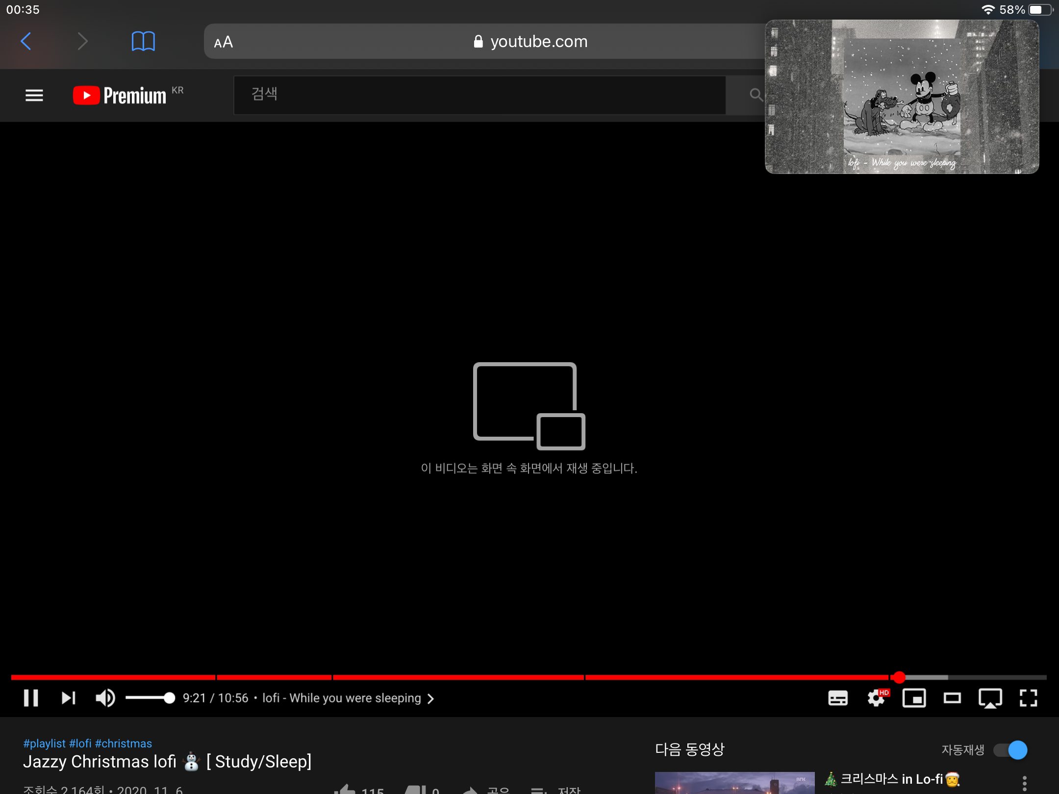 3. 화면 속 화면으로 전환되어 백그라운드에서 음악이 나오며 다른 화면을 틀어도 여전히 동영상이 재생된다.