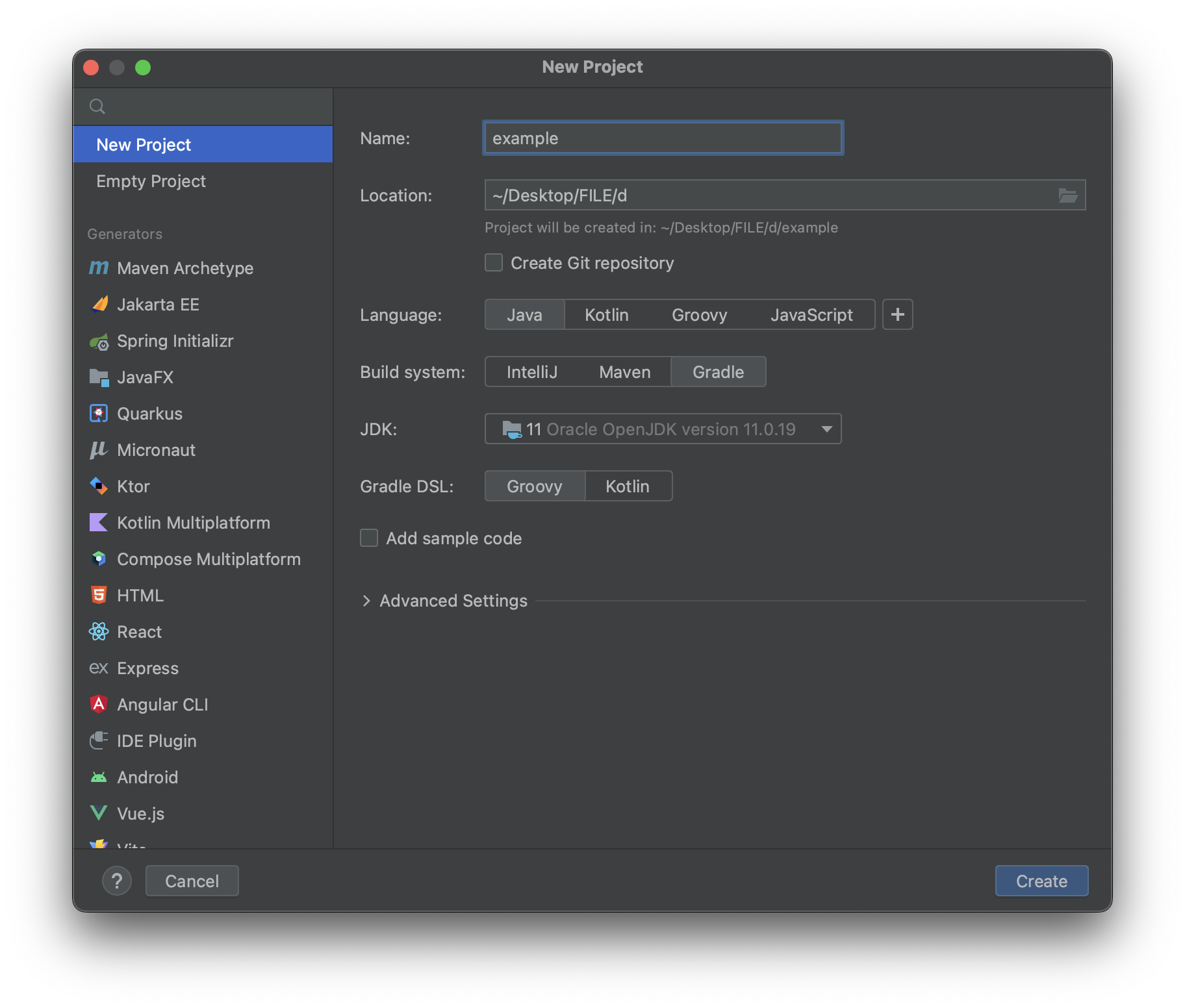 IntelliJ에서 File > New > Project... 를 고르면 다음과 같은 화면이 뜹니다. (Mac 기준)