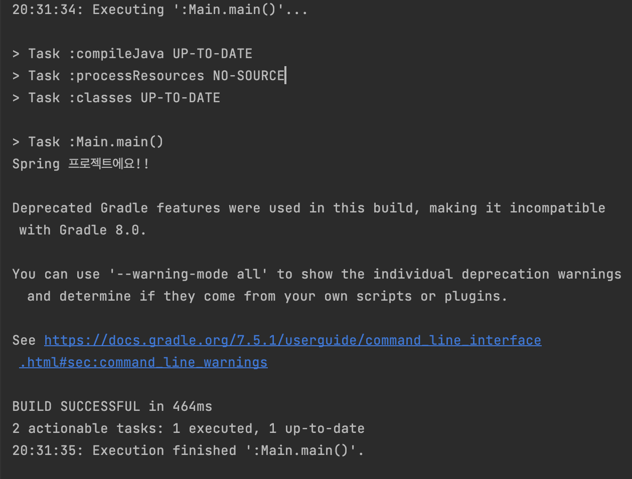 이 메인 클래스를 돌리면 프로젝트가 실행됩니다. 그 결과는?