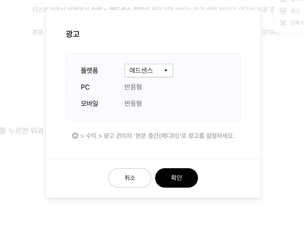 이런 팝업창이 뜬다. 확인을 누르면 에디터에 커서가 있던 곳에 중간광고가 삽입되게 된다.