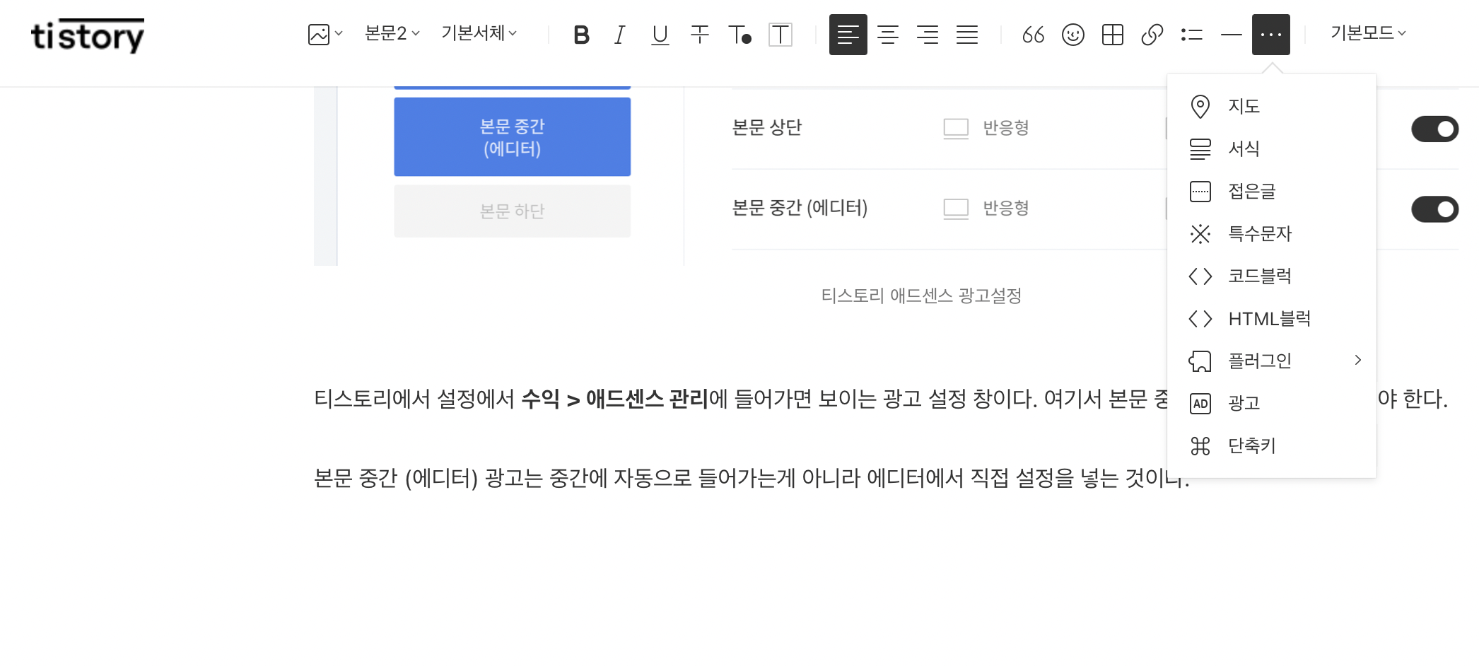 본문 중간 (에디터) 광고는 중간에 자동으로 들어가는게 아니라 에디터에서 직접 설정을 넣는 것이다.