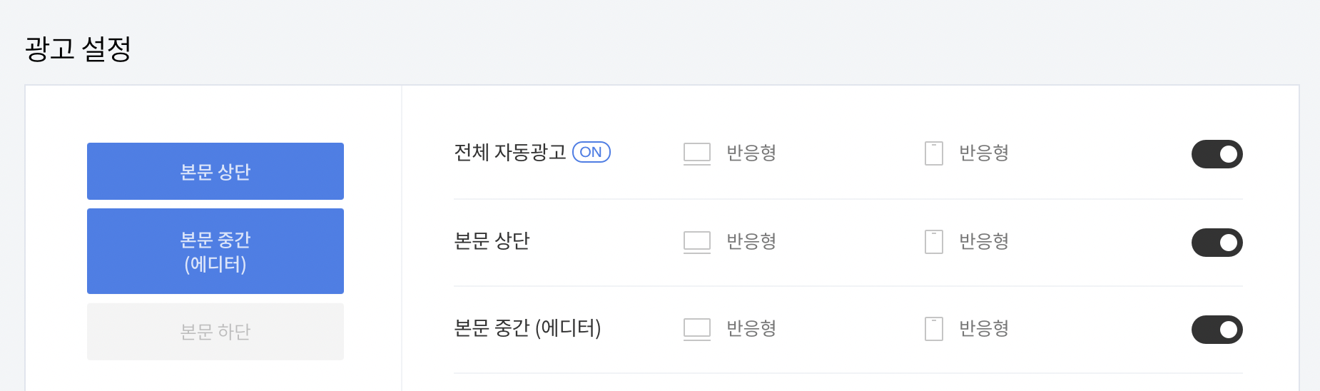 티스토리에서 설정에서 수익 > 애드센스 관리에 들어가면 보이는 광고 설정 창이다. 여기서 본문 중간(에디터)가 켜져 있어야 한다.