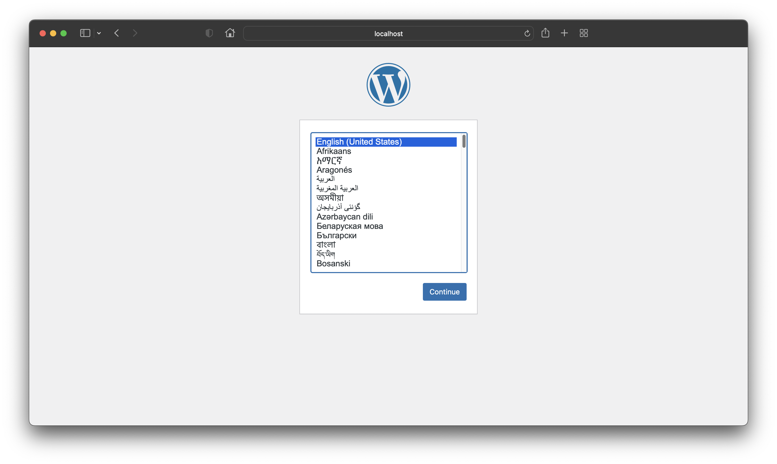 http://localhost:50000에 접속한 결과 워드프레스 컨테이너가 성공적으로 생성된 것을 확인할 수 있습니다.