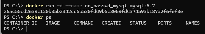 mysql과 같은 애플리케이션을 구동하는 컨테이너는 포그라운드 모드로 실행되기 때문에 -d 옵션을 사용해 백그라운드 모드로 컨테이너 생성.