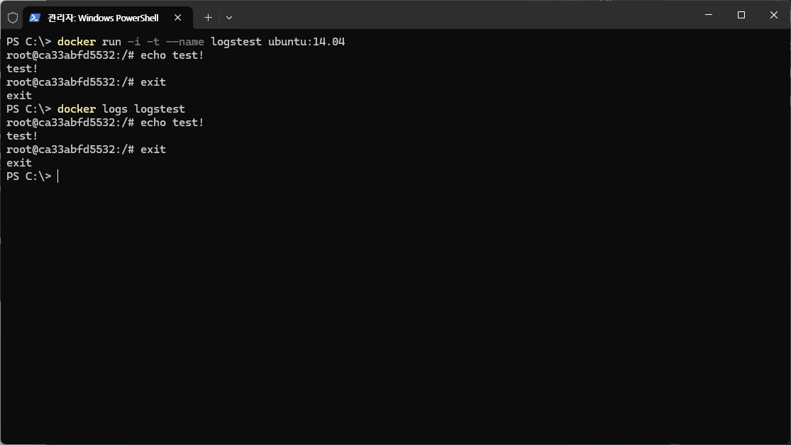 컨테이너 내부에서 bash 셸 등을 입출력한 내용을 확인 가능.