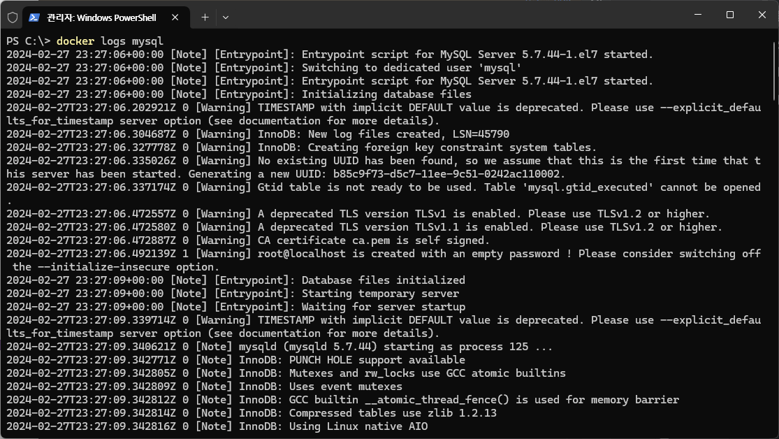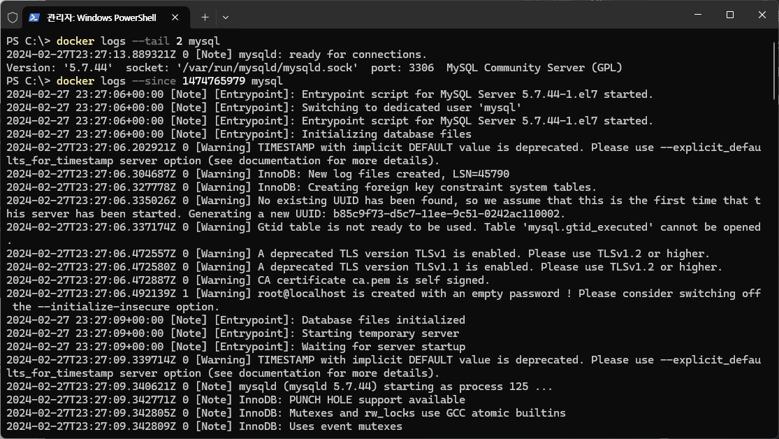 => 잘 구동되는지 여부는 알 수 없지만 docker logs 명령어를 써서 컨테이너의 표준 출력 확인
