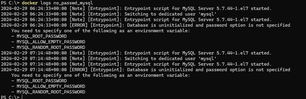 mysql에 실행에 필요한 환경변수를 지정하지 않아 컨테이너가 시작되지 않았습니다.